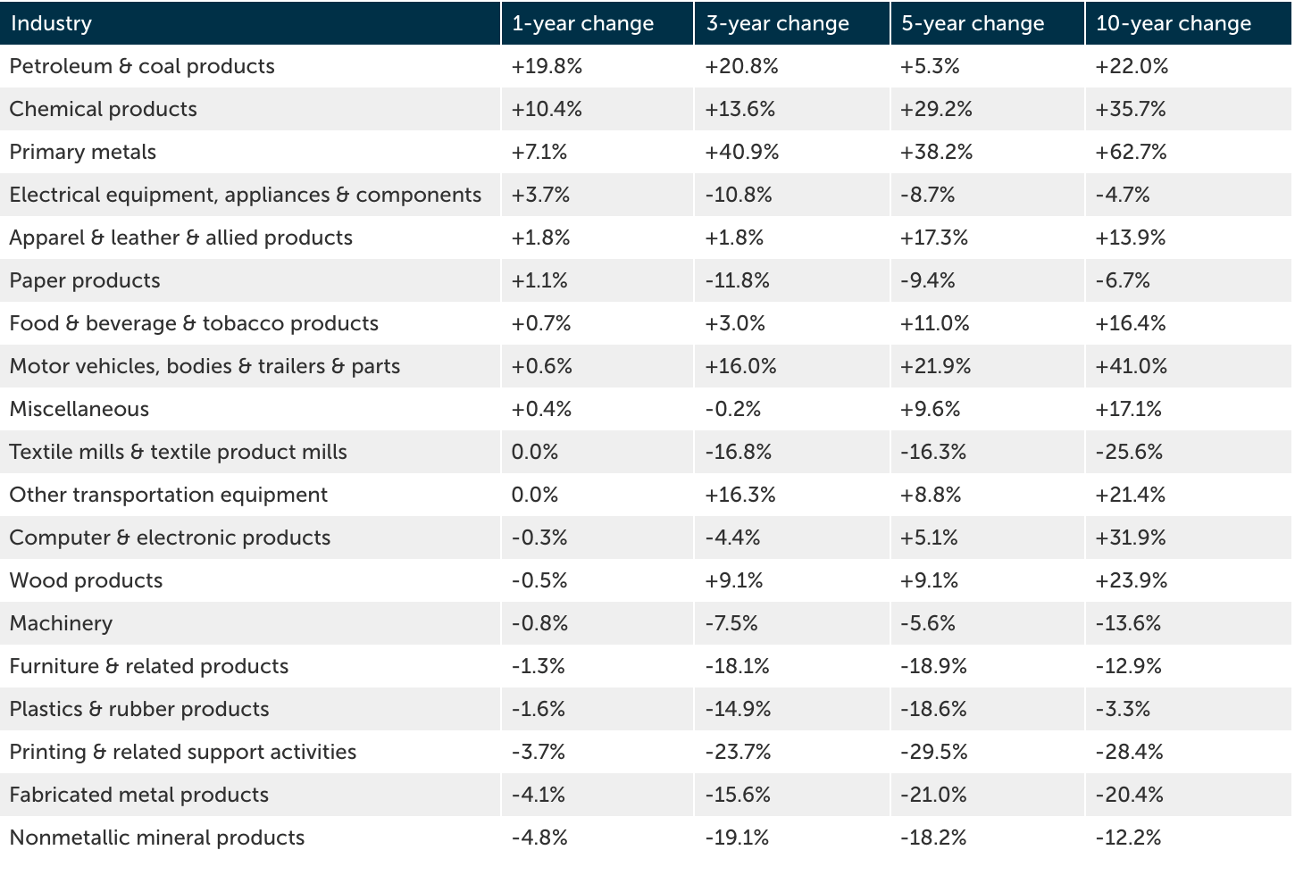 Among manufacturing industries, chemical products and food, beverage, and tobacco products remain the largest, followed by computers and electronics, machinery, and transportation equipment. Recent growth has been most robust in petroleum and coal products (up nearly 20% in one year and 22% over ten years) and chemical products, which have also seen strong gains across 1-, 3-, 5-, and 10-year horizons. In contrast, industries like furniture, plastics, printing, metal products, and mineral products have all declined consistently across these time periods.
